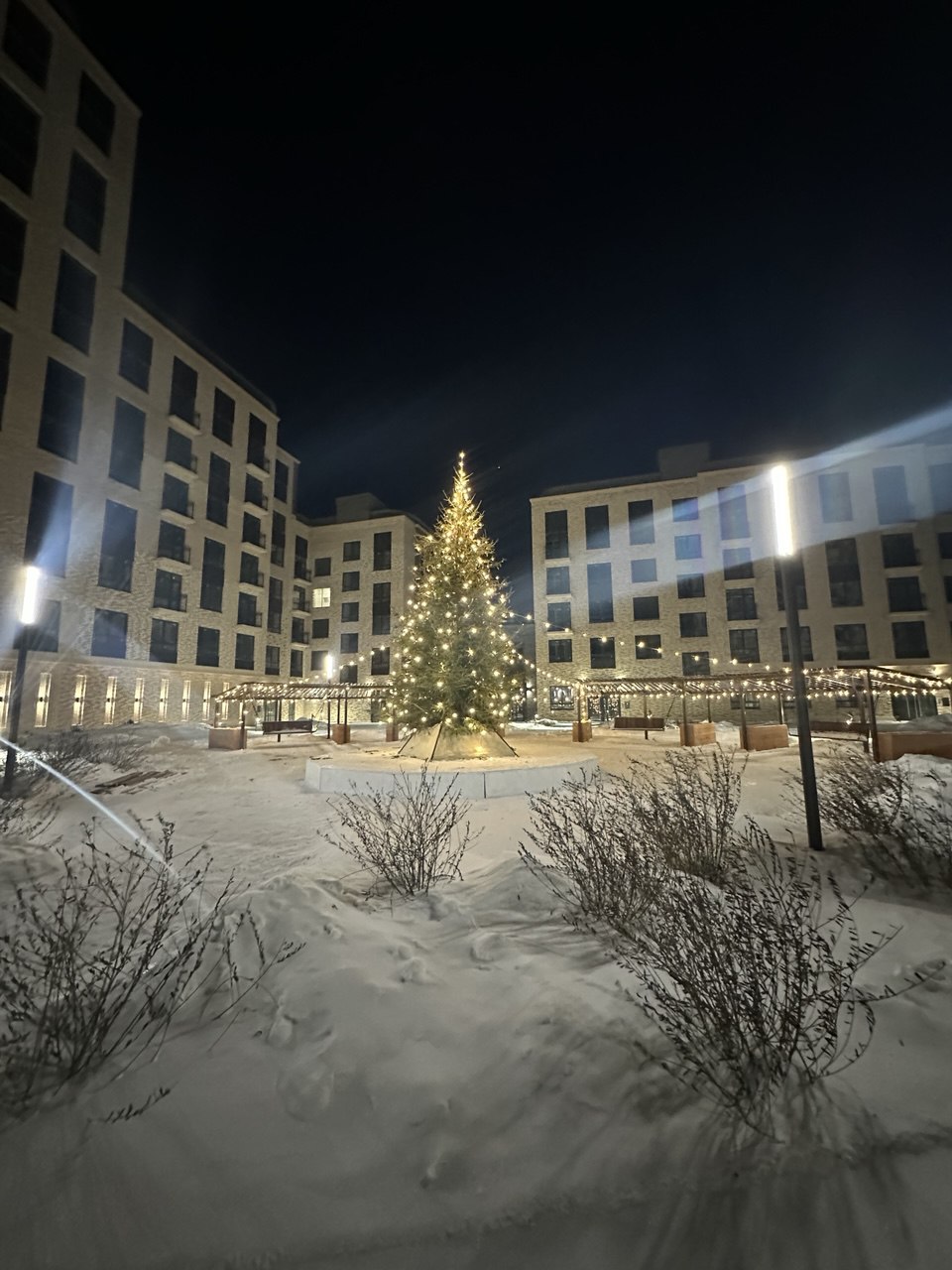 Во дворе жилого комплекса «Карла Маркса» установили новогоднюю ёлку — символ уюта, тепла и приближающихся праздников.